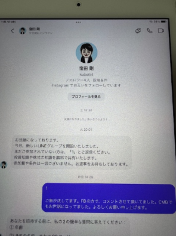 【窪田剛を名乗るInstagramのメッセージ例】 "お世話になっております。今月、新しいLINEグループを開設いたしました。まだご参加されていない方は、「1」とご返信ください。投資情報や株式の知識を無料で共有いたします。参加費や条件は一切ございません。お返事をお待ちしております。"